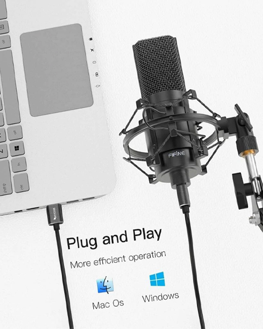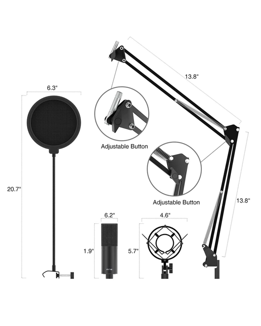 • Studio USB microphone kit comes with rugged metal construction for durability. Features a heavy-duty mic stand that consists of sturdy boom arm and metal desktop mount, it can mount tightly to any desk up to 2” thick. This adjustable boom arm is strong enough to hold the microphone for studio as well as home use.
