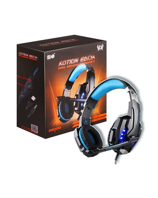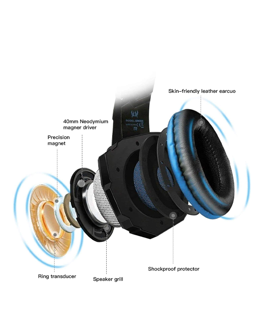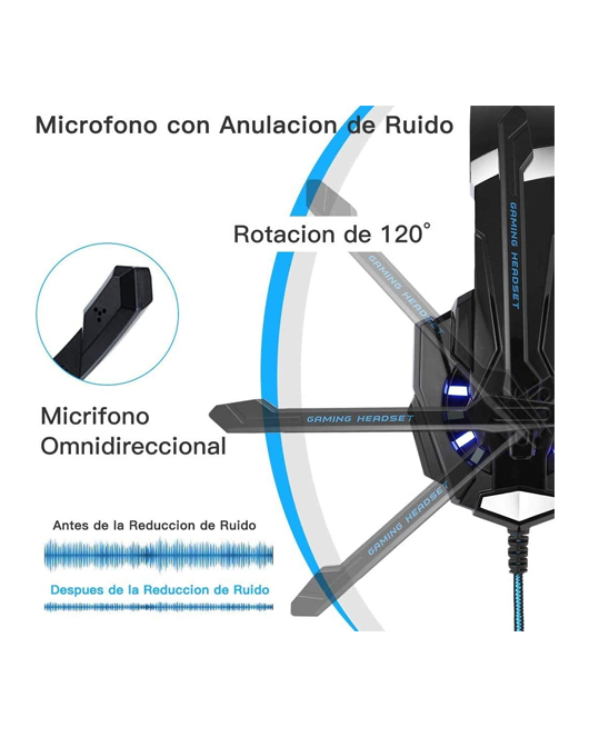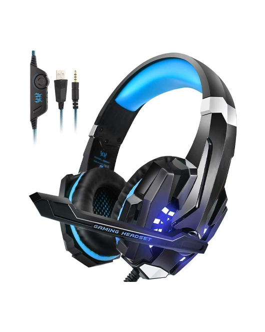 - Comfortable Gaming Headphone for head and mood : Earmuffs made of skin friendly PU leather material , the super soft over ear pads is comfortable for long time wear with light weight . Glaring Blue LED lights are designed on the earcups, highlighting the atmosphere of the game.