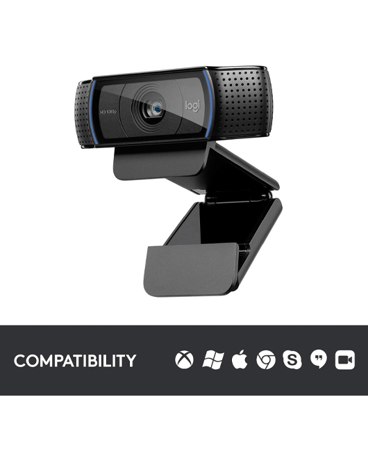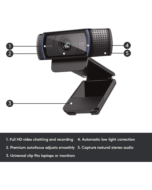تُعد Logitech C920 Pro من أفضل كاميرات الويب عالية الأداء، حيث تتيح مكالمات فيديو بدقة Full HD 1080p وتسجيلات عالية الجودة بدقة 30 إطارًا في الثانية. مزوّدة بميكروفونين ستيريو مدمجين مع تقليل تلقائي للضوضاء وتصحيح ذكي للإضاءة المنخفضة، مما يضمن صوتًا وصورة نقيين حتى في البيئات غير المثالية. تأتي مع مشبك عالمي قابل للتثبيت على اللابتوب أو الشاشة، وقاعدة تدعم الحوامل الثلاثية.