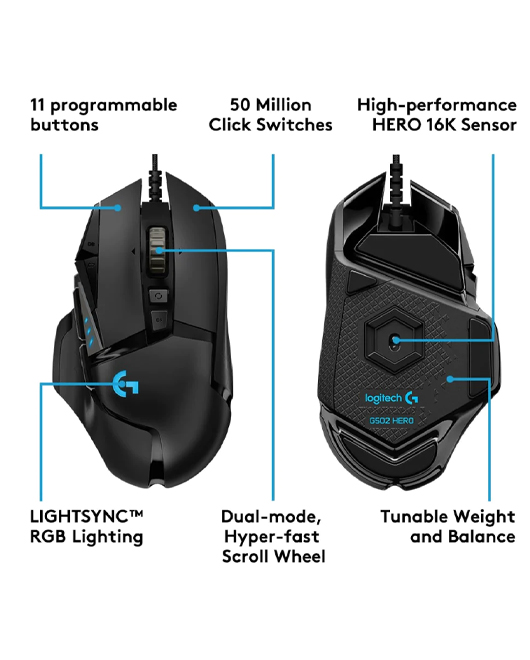يعتبر Logitech G502 HERO من أفضل ماوسات الألعاب بفضل مستشعر HERO 25K المتقدم الذي يوفر دقة استثنائية مع حساسيات تصل إلى 25,600 DPI. يتيح لك هذا الماوس تخصيص الأزرار والإضاءة والوزن لتتناسب مع أسلوب لعبك، مع 11 زرًا قابلاً للبرمجة وذاكرة مدمجة لحفظ إعداداتك. كما يتميز بإضاءة RGB قابلة للتخصيص وتقنية Lightsync المتقدمة لتقديم تجربة بصرية فريدة.