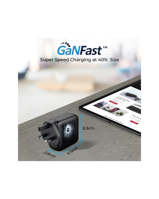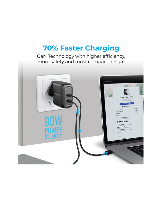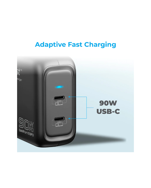 Using next-generation GaNFast (gallium nitride) technology for reduced size and high power transfer, GaNPort-90PD can charge up to 2 devices at the same time – from earbuds to phones, to tablets and laptops. Portable power optimized.
