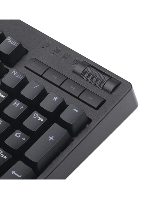 GAMING KEYBOARD WITH 5 PROGRAMABLE MACRO KEYS AND VOLUME CONTROL WHEEL; Total 114 keys Full Sized Mechanical Gamimg Keyboard with Custom Mechanical Switches (Cherry MX BLUE Switches equivalent). Designed for longevity with greater durability and responsiveness. The Mechanical Keyboard Quiet Keys offer fast, clicky, crisp and precise tactile feedback for ultimate typing and gaming performance. The switches are of the highest quality, tested for 50 million keystrokes