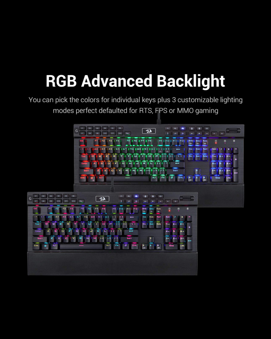 • WITH 12 Programmable MACRO KEYS RGB Backlit Mechanical Gaming Keyboard, the RGB Led illuminated keyboard comes with molded keycaps offering crystal clear uniform backlighting and lettering that doesn’t scratch off. Featuring a Total of 18 Backlight Modes, 8 different colors, 5 backlight brightness levels, breathing speed, and user defined backlighting