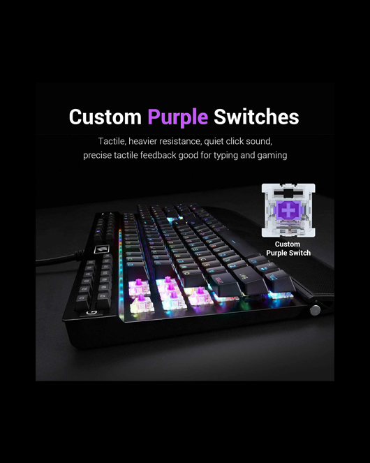 • 131 Key Mechanical Gaming Keyboard with Custom Mechanical Brown Switches designed for longevity with greater durability and responsiveness. The Mechanical Keyboard Keys offer medium resistance, medium click sound, and crisp, precise tactile feedback. Ideal for both; ultimate Gaming performance and for office environments, where a too loud clicky sound might annoy others