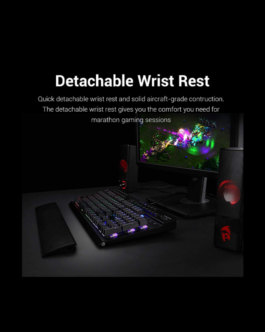 • The PC Gaming keyboard is constructed of Aircraft-Grade Aluminum. Plate-mounted mechanical keys and switches that stand up to tough gaming conditions. The detachable wrist rest gives you the comfort you need for marathon gaming sessions