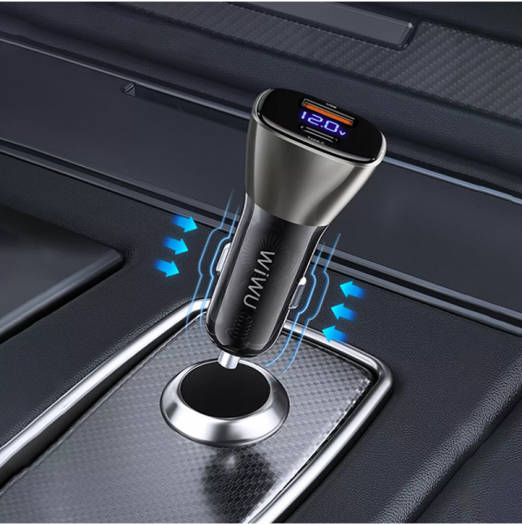 شاحن سيارة WiWU PC500 مزود بمنفذي شحن سريع USB A وType-C يدعمان تقنيات PD وQC3.0، مع شاشة عرض الجهد 240 فولت لمراقبة حالة البطارية بدقة. يوفر أداءً قويًا لشحن الأجهزة بسرعة وكفاءة في السيارات والشاحنات، مع توافق مع مدخل تيار 12-24 فولت.